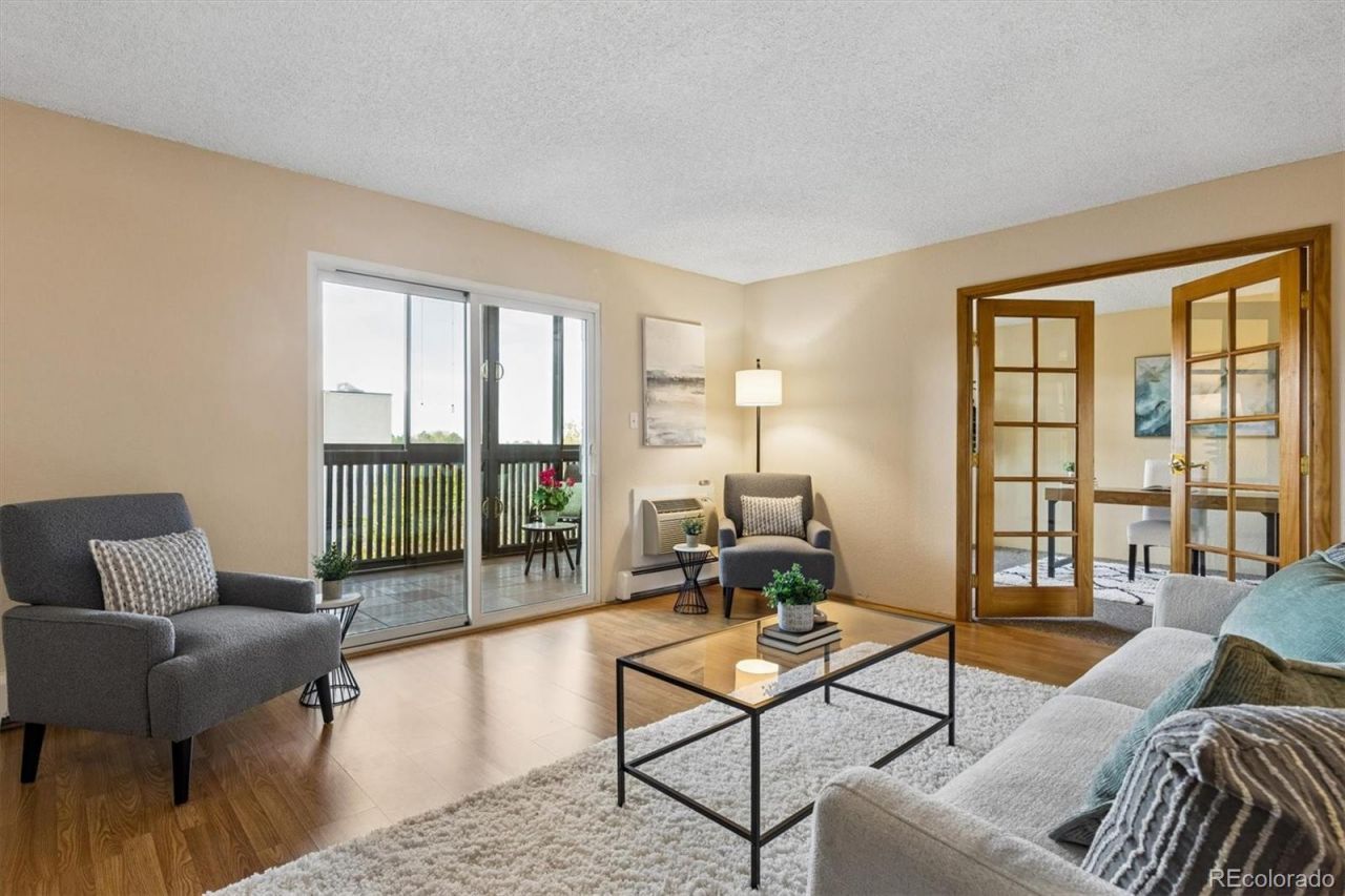 This is the ONE! Step into this delightful Morningside Penthouse and fall in love! The open floor plan makes for easy entertaining! The living room and dining room (or den) open to the enclosed lanai, where you will enjoy the ioe view of our Colorful Colorado seasons. The kitchen was updated with 42 cabinets, granite counters with tile backsplash, and two pantries. The second bedroom is featured as a home office, with French Doors that open to the living room. The large primary bedroom has a large walk-in closet with newer shelving, and an updated EnSuite bath with frameless shower doors and an upgraded vanity. The EnSuite laundry room has cabinets and a newer washer and dryer on pedestals with storage for laundry supplies. Upgraded features include: Laminate flooring, newer bedroom windows, upgraded lanai windows, newer patio doors, and a new Electric Panel. You will find that this residence is ready for you to move in and enjoy! Morningside offers a maintenance-free lifestyle with lush landscaping, walking paths, and a Clubhouse in the heart of the community featuring indoor and outdoor pools, a picnic area with BBQ grills, a fireplace lounge, card/party/billiard room, and a kitchenette with serving bar. Enjoy a short walk to Hutchinson Park. Nearby shopping includes Whole Foods, King Soopers, Target, Tamarac Square, Tiffany Plaza, and more. This residence is an excellent opportunity to enjoy comfort, convenience, and community, in a prime Denver location with a solid HOA, which is financially strong, and professionally managed with an active Board of Directors.